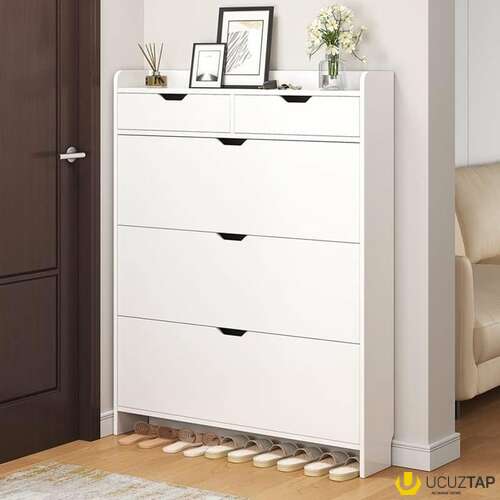 - Qatlar və yer: Ayaqqabılar, kitablar, bəzək əşyaları və digər şəxsi əşyalar üçün ideal olan 3 pilləli ayaqqabı rafı, 2 çekmece