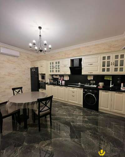 Паркетные полы, мраморное покрытие с подогревом, 2 санузла оборудованы душ кабиной, сантехникой и аксессуарами, гардеробная, встроенная кухонная мебель, свет газ вода постоянно и т.д.