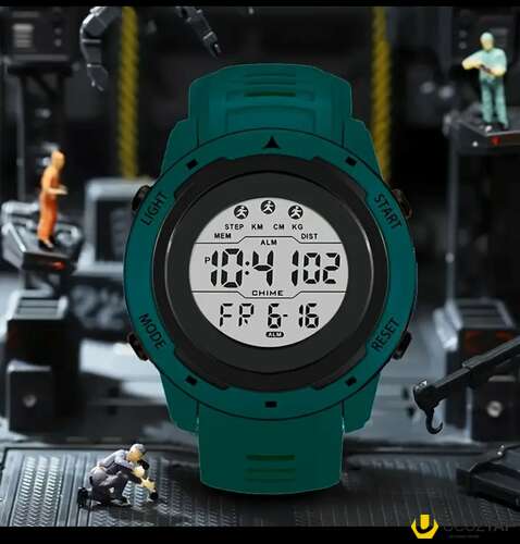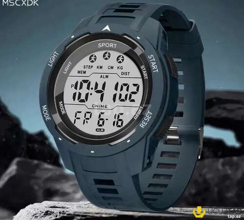 - Funksiyalar: saat, dəqiqə, saniyə; tarix və həftənin günü göstəricisi; siqnal (ALM), chime; xronometr/stopwatch (START/RESET); yaddaş (MEM). Üst paneldə addım sayğacı (STEP), məsafə (KM/DIST), boy/çəki ölçü vahidləri (CM/KG) üçün rejim nişanları göstərilir.