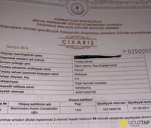 Oğuz rayonu, Baş Daşağıl kəndində, 2-hektar, (200sot) torpaq sahəsi satıram. Torpağın sənədi, Çıxarış (Kupça). Bakıda daşınmaz emlakla, Barter etmək mümkündür. Çox gözəl və mənzərəli yerdə, yerləşir. Göbür bulagı deyilən yerdə. Saf-Təbiət istirahət mərkəzi ilə üzbə-üz. Torpağın təyinatı, Sahibkarlıqdı. Torpağı alan istədiyi, Restoran, OteI, istirahətt mərkəzi və s. tikə bilər. Şəxsidi özümüzə məxsusdur.