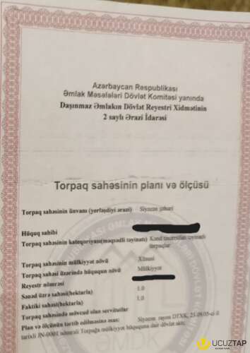 - Sahə: 1.0 hektar (sənəd üzrə və faktiki)
