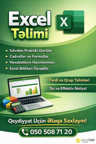 Excel proqramını sıfırdan öyrənmək istəyənlər üçün praktiki dərslər təşkil olunur. Dərslər zamanı cədvəllərin hazırlanması, formulların tətbiqi, hesabatların qurulması və iş üçün vacib olan Excel bilikləri öyrədilir. Təlimlər sadə və anlaşıqlı şəkildə izah olunur.
