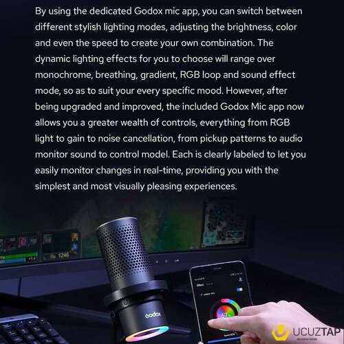 Godox brendinin EM68X Rgb işıqlı kondenser gaming mikrofonu?️. Podkastlar, gaming və canlı yayınlar üçün əvəzolunmaz mikrofon. Telefonda bluetooth-la Godox Mic APP vasitəsiylə RGB idarəsi və digər özəlliklər mövcuddur. Daxili pop filterə sahibdir. Windows PC, PS5, PS4, iphone, android telefonlar və Mac dəstəkləyir. Yenidir.